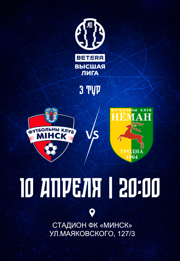 Вход платный. Билеты можно приобрести здесь – https://www.ticketpro.by/bilety-na-sportivnye-meropriyatiya/fk-minsk—fk-neman-10-aprelya-2026/