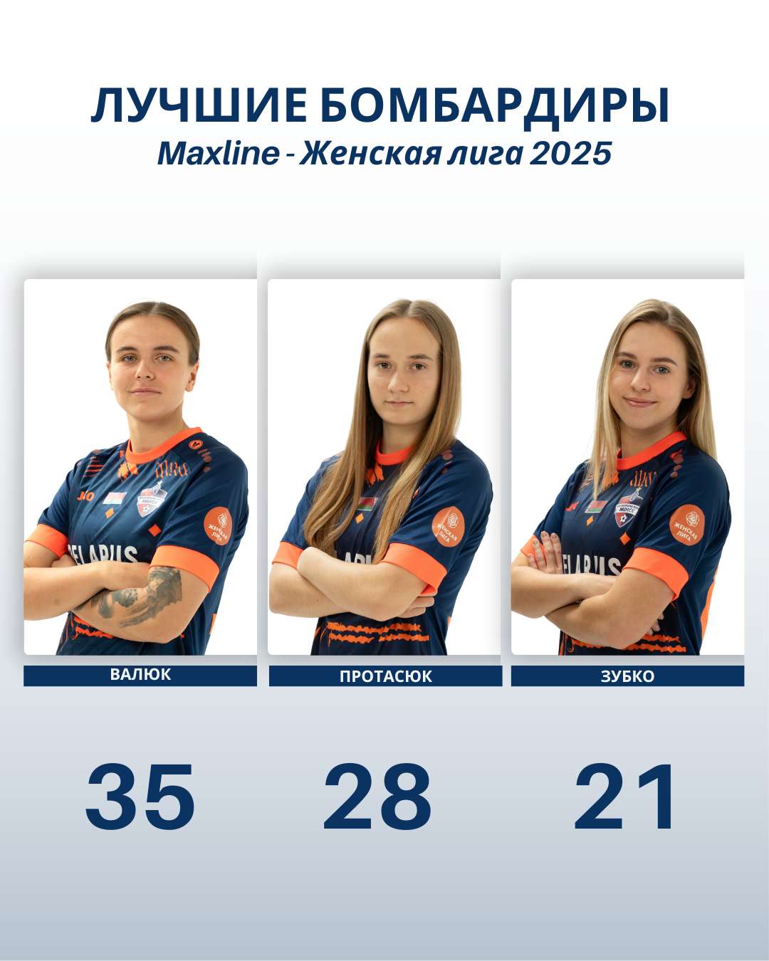 На счету Виктории 35 забитых мячей, Дарья поразила ворота соперников 28 раз, а Мирослава отличилась 21 голом.