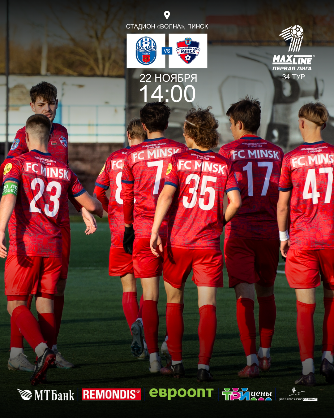 Команда нашего клуба «Минск-2», закроет текущий сезон матчем 34-го тура чемпионата Maxline-Первая лига 2025 года, в субботу, 22 ноября, на стадионе в Пинске против местной «Волны».
