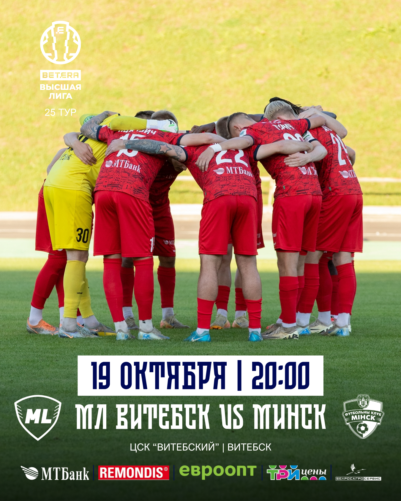 В воскресенье, 19 октября, мужская команда ФК «Минск» проведет матч 25-го тура «BETERA – Чемпионат Республики Беларусь по футболу 2025 года» с «МЛ Витебск».