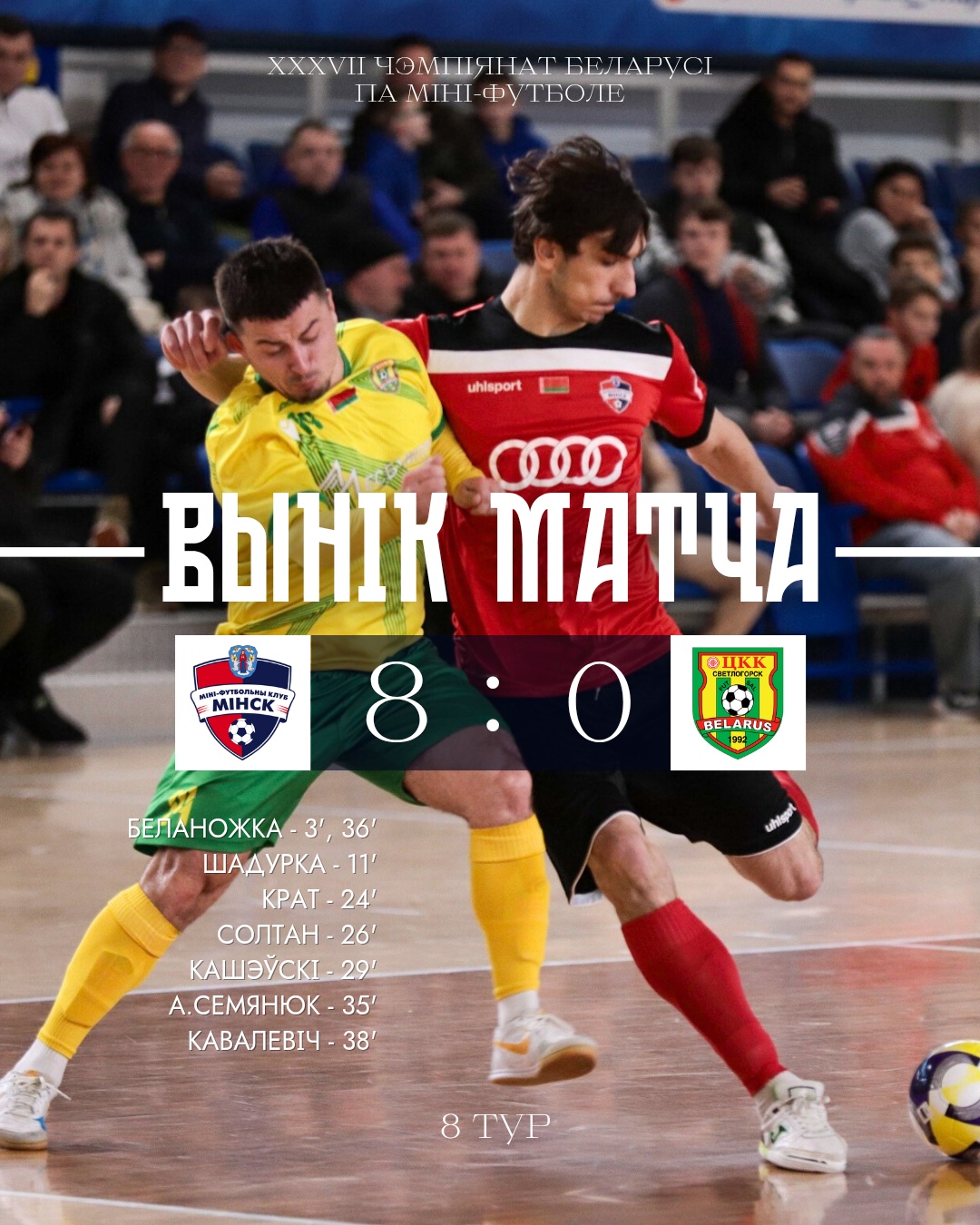 В субботу, 1 ноября, в матче 8-го тура XXXVII чемпионата Беларуси по мини-футболу МФК «Минск» на своей площадке одержал крупную победу над «ЦКК (Светлогорск)» — 8:0 (первый тайм — 2:0).