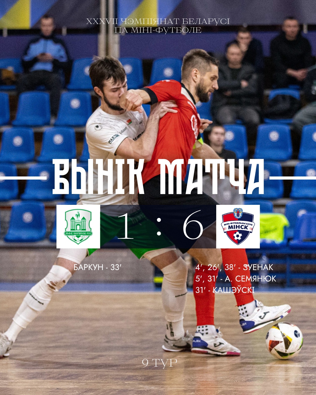 В субботу, 15 ноября, в матче 9-го тура XXXVII чемпионата Беларуси по мини-футболу МФК «Минск» на выезде одержал крупную победу над «Барысаў-900» — 6:1.